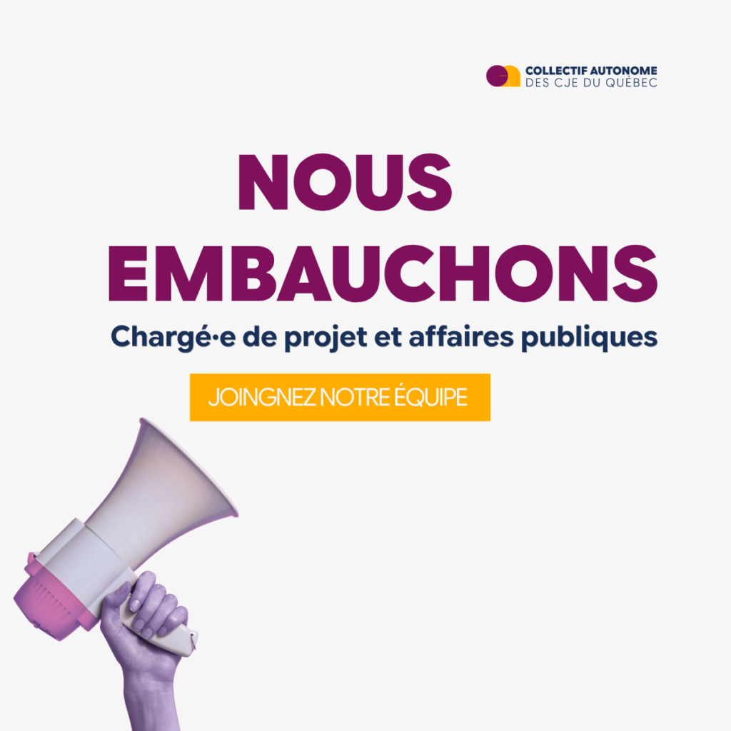 Faites parvenir votre CV ainsi qu’une lettre de motivation à la direction générale du Collectif autonome des CJE du Québec à l’adresse suivante :